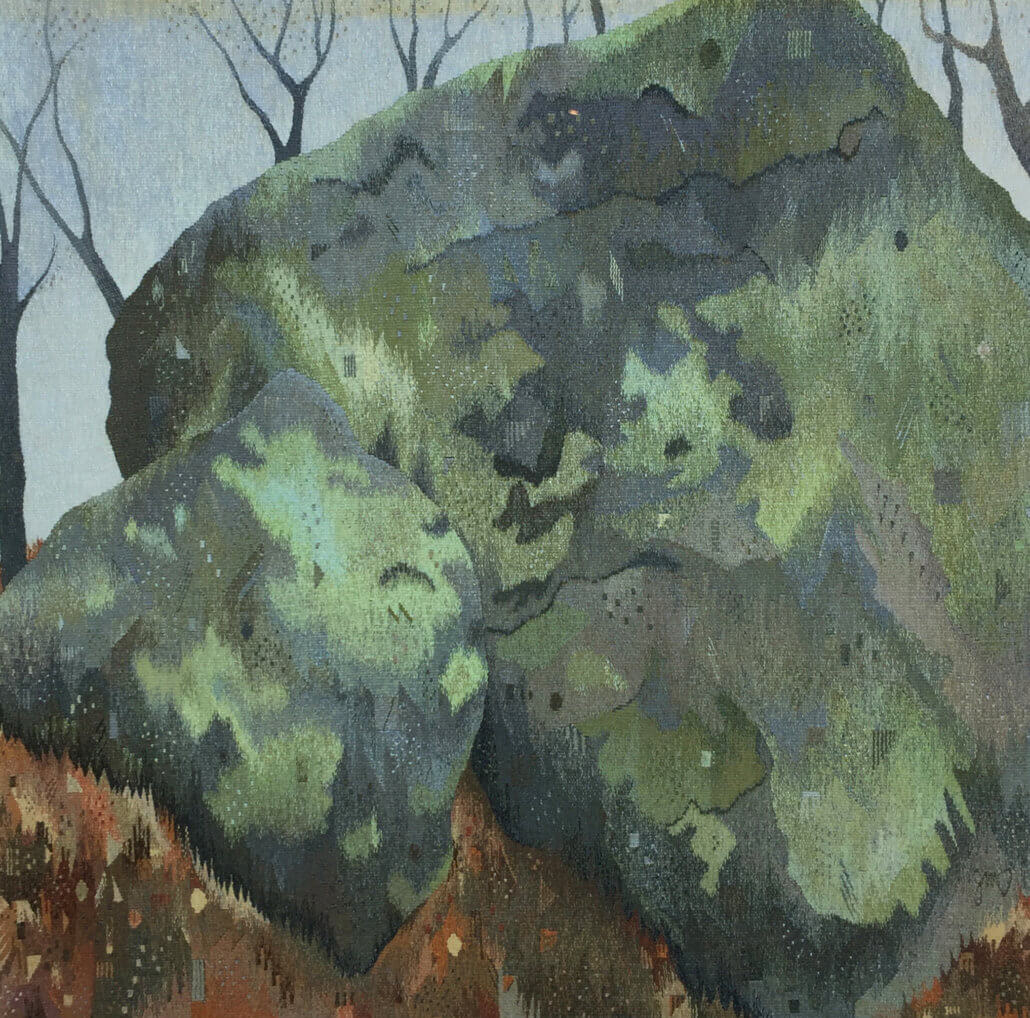 Her recently completed tapestry, Signal Rock, 80″x 80,” wool, silk and linen, took several months to hand-weave, and is inspired by a large rock where the artist and her sisters would spend time as children on the island.